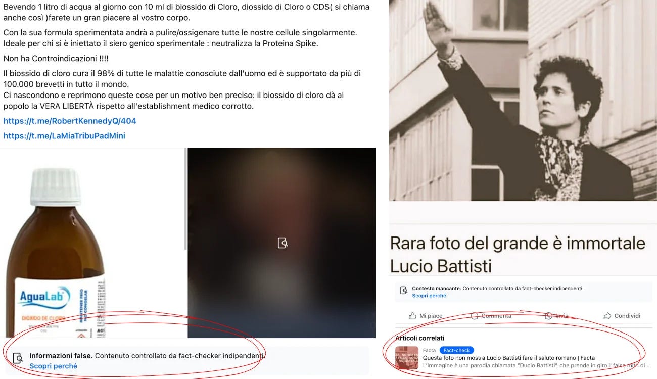 i contenuti che verifichiamo non vengono rimossi (ma ci vengono applicate delle etichette con link agli articoli di fact-checking)